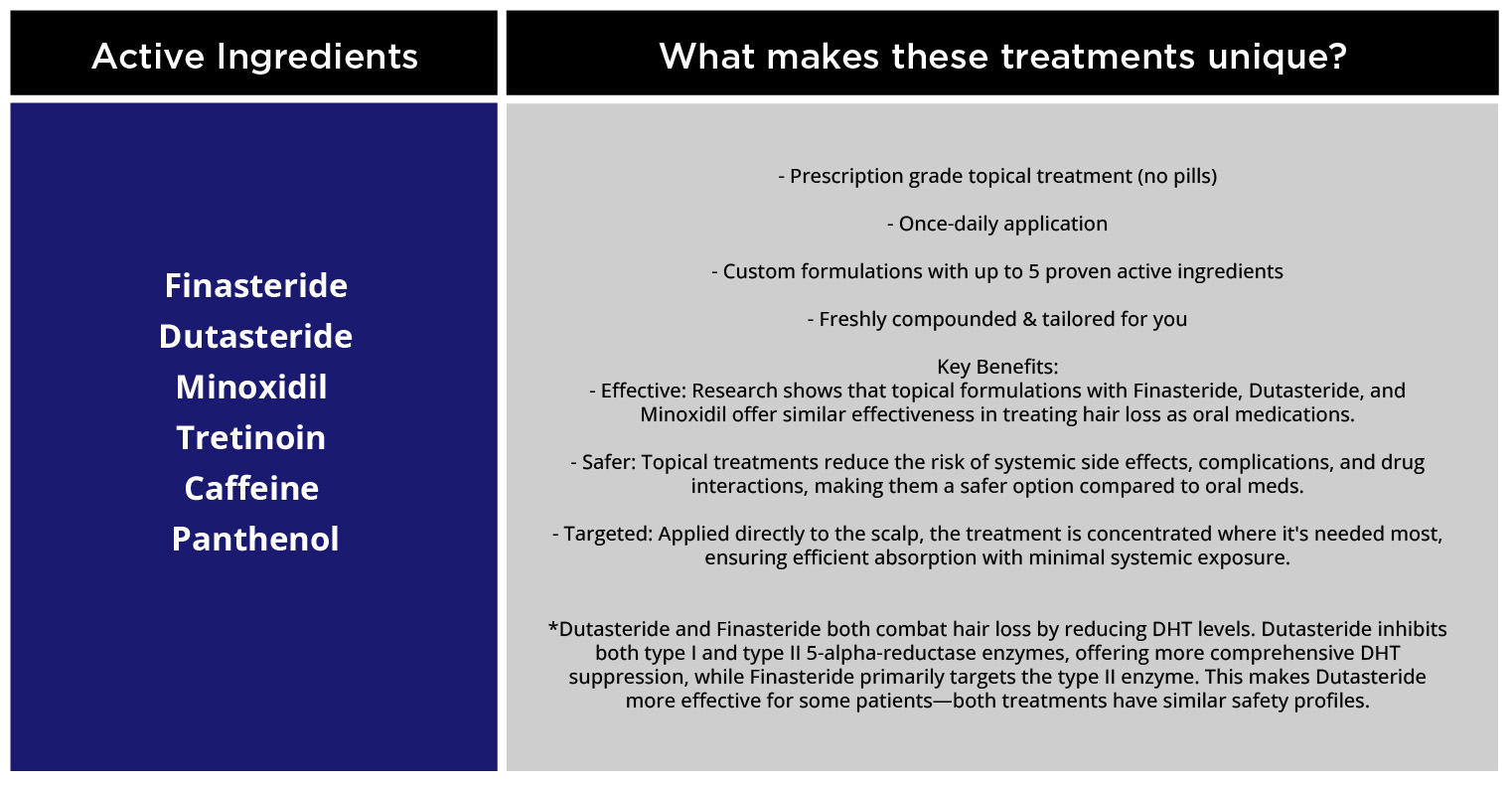 Get access to effective prescription-grade topical hair loss treatments with multiple pharmaceutical active ingredients, including the following: